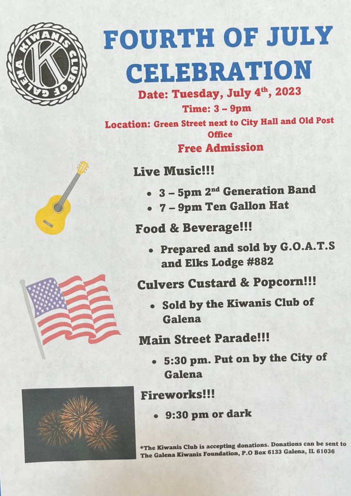 10 MayIt’s getting to be that time of year again where we all get together to celebrate Independence Day with a bang! The Kiwanis Club of Galena is hosting its 29th annual Fireworks Celebration on Tuesday, July 4th, 2023 in the City of Galena. The celebration will begin with a party on historic Green Street with live music, food, and beverages, followed by the best fireworks show of the year! We are currently seeking donations. We rely on the help from individuals, businesses, and organizations to make this event possible. Any amounts are greatly appreciated! Donations can be sent to The Galena Kiwanis Foundation, P.O. Box 6133 Galena, IL.